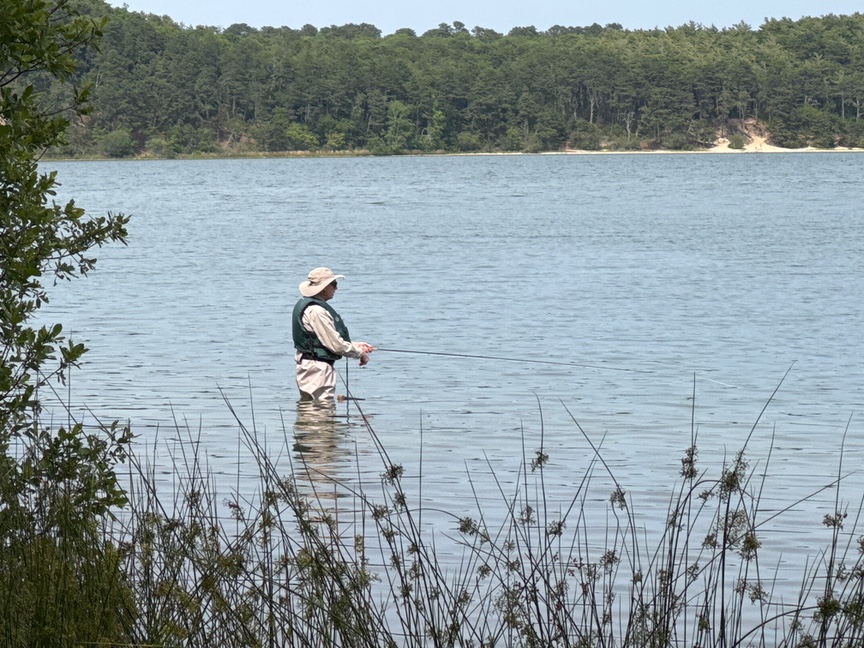 A fisherman along Cliff PondThe hikes are level for the most part level, and the trails are very well-maintained. Because most of the trails ring the ponds, they are relatively busy, and in the summer there will be quite a few people at the beaches with car access. There are a lot of beaches here and you can absolutely find a quiet spot to settle down. In the three days I was at the park, I ran into only one other person on Higgin’s Pond, and they were just cutting through on their way to Eel Pond.