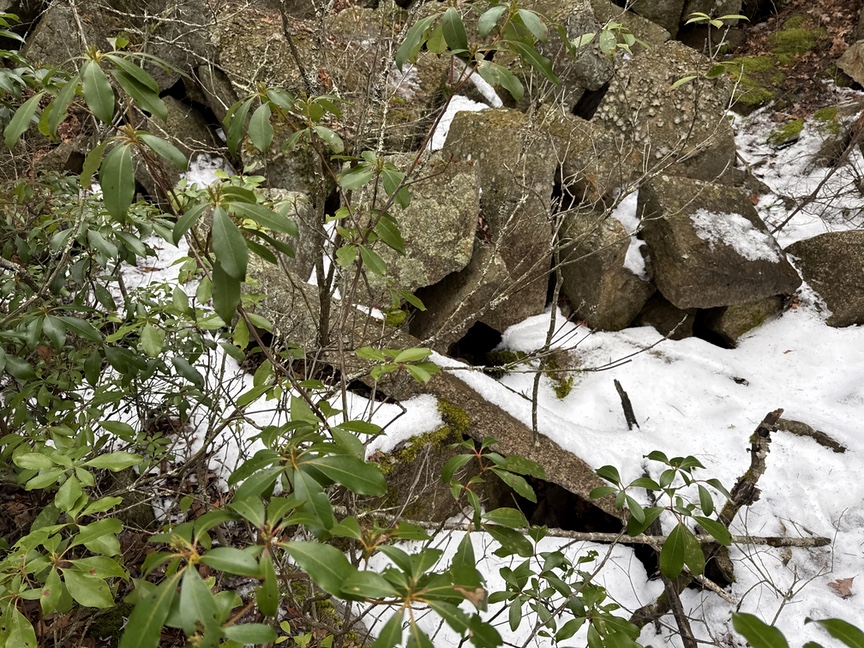 Something I like to do when I run across a cellar hole or foundation, or steps, is to try to figure out which rock the material came from. At Douglas it isn’t hard, typically if you just spin around you’ll spot the nearby source. There are a few larger quarries scattered around, like the one below in which you can see a nearly finished post.