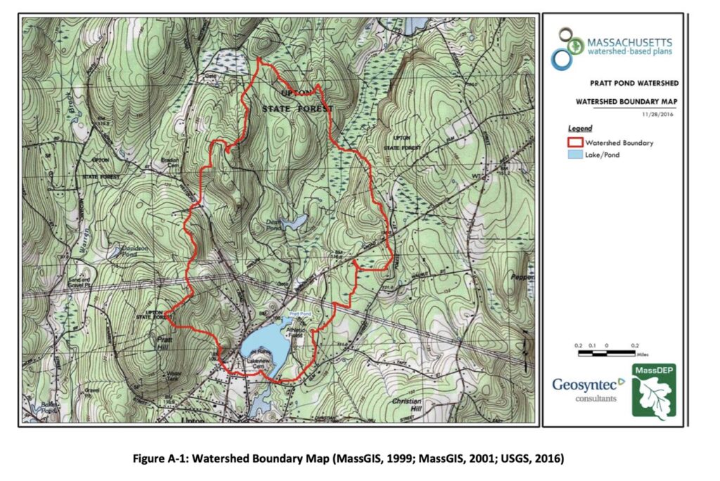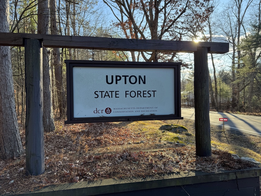 Upton State Forest, specifically Pratt Pond which nestles on its southern border, is the most significant geographical location in the entire Commonwealth of Massachusetts. This is because Pratt Pond is the source for nearly every major river in eastern and central Massachusetts — within a day’s walk of Pratt Pond, rain falling on different hillsides will end its journey in Boston Harbor, Narragansett Bay, Portsmouth at the mouth of the Merrimack, or Long Island Sound.